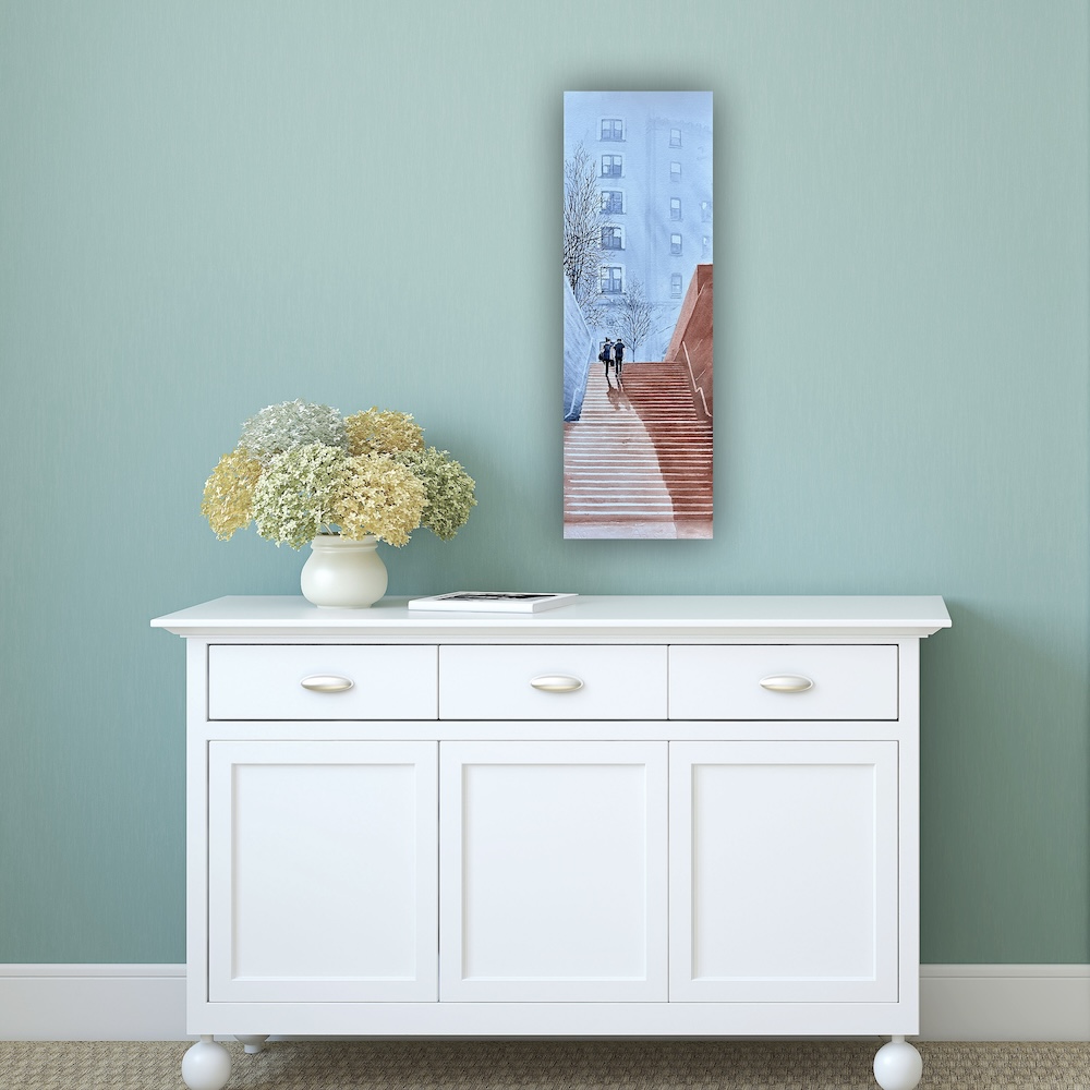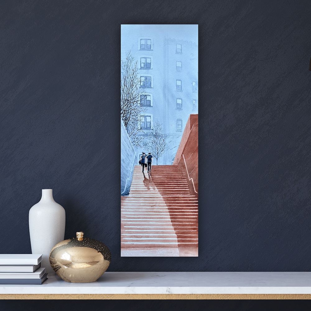 Two people ascend the staircase that connects Sussex Drive and Mackenzie Avenue leading to Chateau Laurier. The hotel looms majestically in the background, its muted grey tones softened by the bright sunlight that bathes the scene in warmth. The use of a limited palette is particularly striking; while the Château appears almost ethereal and subdued, it is contrasted beautifully by the bold rusty brown hues used on the staircase and its accompanying shadows. "Returning to the Chateau" is not just a visual feast but an invitation to reflect on moments shared in such enchanting urban spaces.