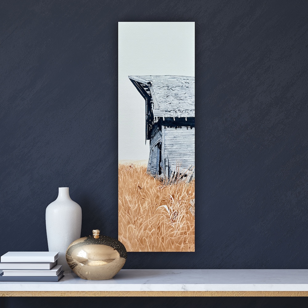 A watercolor painting inspired by an old weathered barn in a field. Light and shadow bounce off the structure where many memories reside.